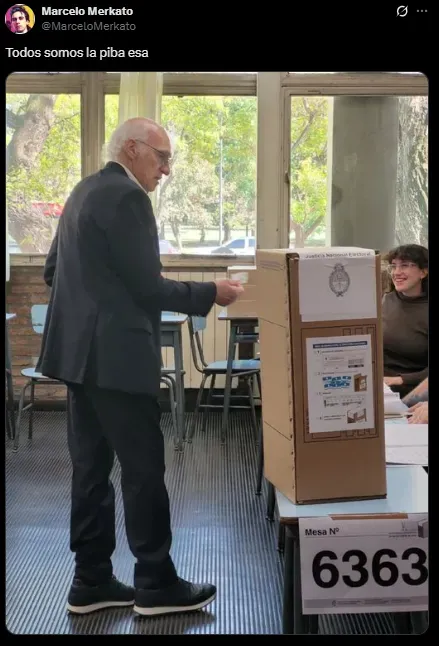 Vestido de camisa y traje como de costumbre, el Virrey cumplió su deber cívico cerca de Barrio Parque donde vive hace muchísimos años. “Todos somos la piba esa“, publicó un usuario de X (Twitter) por la expresión de una de las autoridades de mesa al quedar frente a la leyenda.