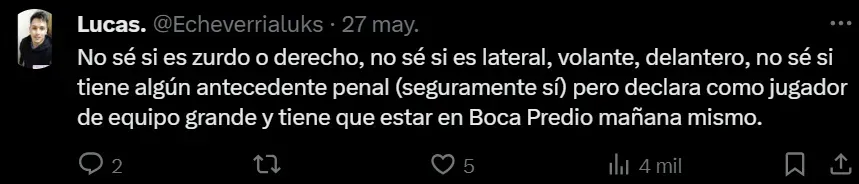 Esto generó muchos comentarios que, ante su mentalidad, quedaron convencidos por su posible llegada al conjunto de la Ribera. “Que fácil me compró… tiene que estar mañana mismo en Boca Predio” y “Uy uy uy lo quiero ya en Boca Predio, después vemos como juega, pero esa personalidad necesitamos”, fueron algunos de los comentarios, elogiando su gran personalidad.