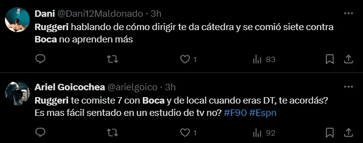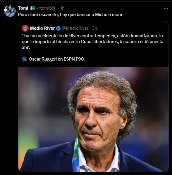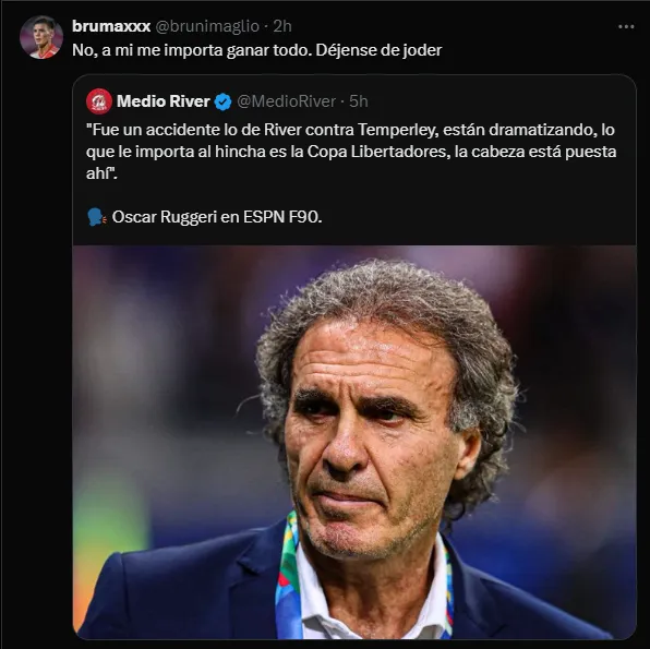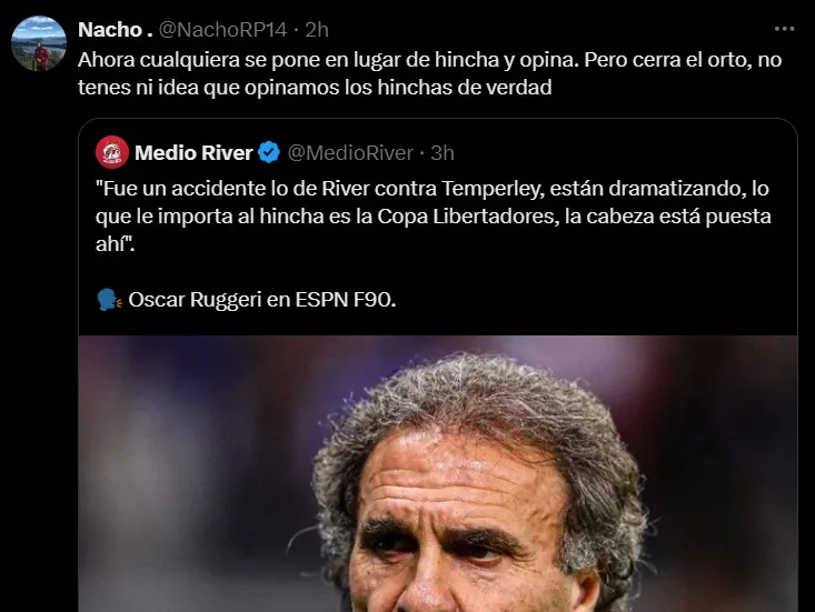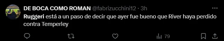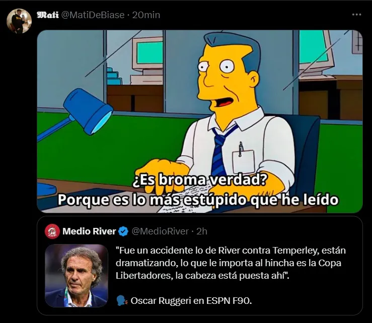 Otro simpatizante también hizo hincapié en su declaración y se burló en Twitter: “Ruggeri está a un paso de decir que ayer fue bueno que River haya perdido contra Temperley“.