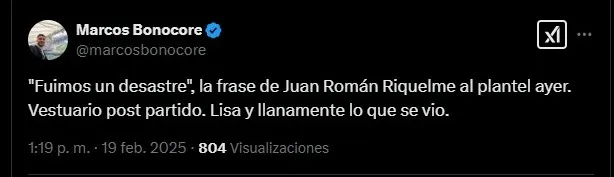 Según contó el periodista Augusto César en ESPN, Riquelme habló con los jugadores de Boca después de perder en Lima. Y el presidente no se guardó nada: “Riquelme charló con el plantel. No le gustó para nada lo que vio. Fue muy crítico con el plantel, sabiendo que lo mejor que pasó anoche fue el resultado. El mensaje del presidente es pensando en lo que viene. Fue una reunión entre el plantel y el presidente después del partido“.