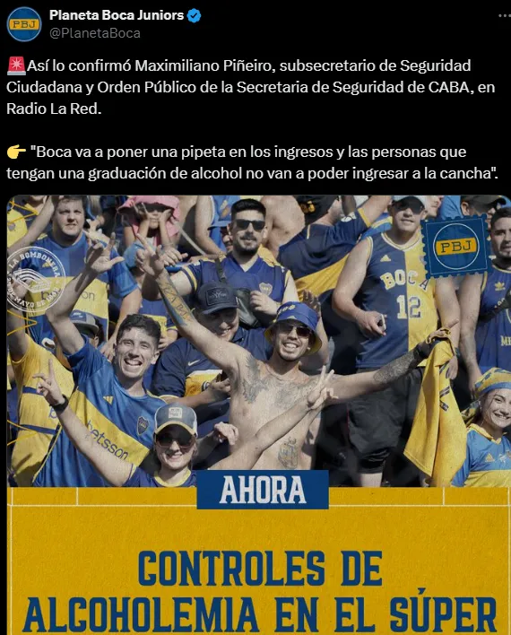Esto implica que quienes asistan a ver al Xeneize no podrán tomar alcohol antes de ingresar a la cancha. “Es algo importante y novedoso. Vamos a hacer la prueba de alcohol cero este sábado: las personas que tomen alcohol no pueden ingresar a ver fútbol”, señaló Piñeiro.