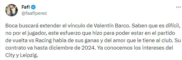 Previo a la definición de los cuartos de final, la dirigencia marcó su postura en caso de clasificar a la próxima etapa. Superada esta instancia, iniciará gestiones con algunos integrantes del plantel. Y así será. De acuerdo a la información que brindó Facundo Pérez, “Boca buscará extender el vínculo de Valentín Barco”.