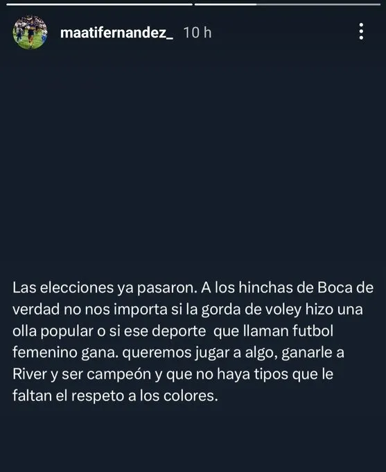 A través de una historia de Instagram, el hermano del volante compartió un duro texto: “Las elecciones ya pasaron. A los hinchas de Boca de verdad no nos importa si la gorda de voley hizo una olla popular o si ese deporte que llaman fútbol femenino gana”, comienza.