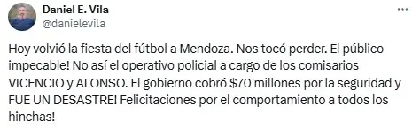 Más allá de que el presidente de la Lepra elogió el comportamiento de los hinchas, mostró su enojo por el operativo. “Hoy volvió la fiesta del fútbol a Mendoza. Nos tocó perder. ¡El público impecable! No así el operativo policial a cargo de los comisarios Vicencio y Alonso ¡El gobierno cobró $70 millones por la seguridad y fue un desastre!”, escribió en “X” (Twitter).