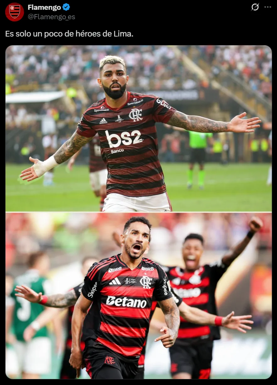 Justamente el “Mengao” se acordó del eterno rival con una gastada en las redes luego de la consagración. Recordando la final que disputaron ambos también en Lima, la cuenta del equipo brasileño posteó: “Es solo un poco de héroes de Lima“.