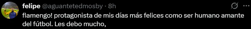 “Te quiero mucho Mengao”, “Flamengo, protagonista de mis días más felices como ser humano amante del fútbol. Les debo mucho”, “Gigantes”, ”JAJAJAJA”, fueron algunos de los comentarios que postearon aprovechando la cargada del equipo carioca a River por aquella final del 2019.