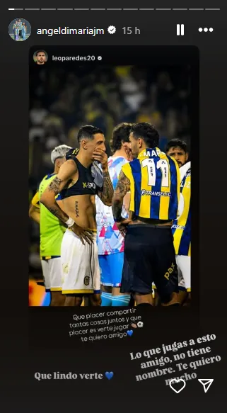 Leandro Paredes y Ángel Di María se tiraron flores en Instagram luego de haberse enfrentado en Rosario. “Qué placer compartir tantas cosas juntos y qué placer es verte jugar. Te quiero amigo“, escribió el volante. Luego, el extremo reposteó la historia y respondió: “Lo que jugás a esto amigo, no tiene nombre. Te quiero mucho“.
