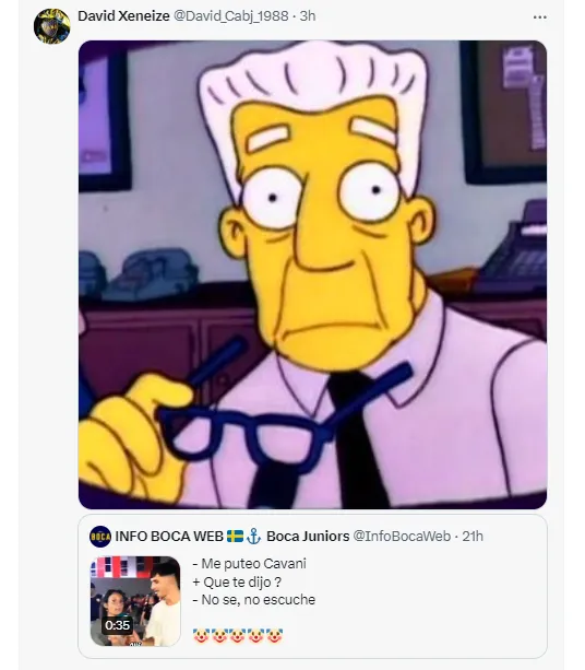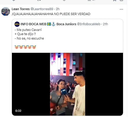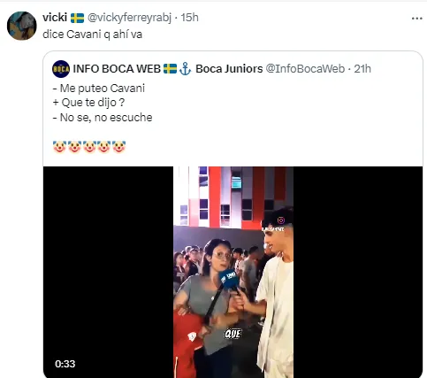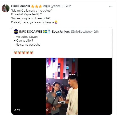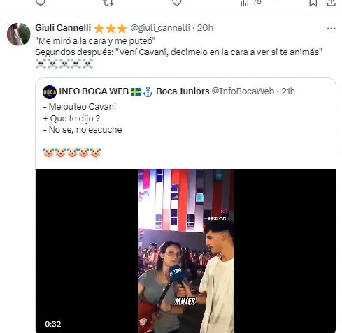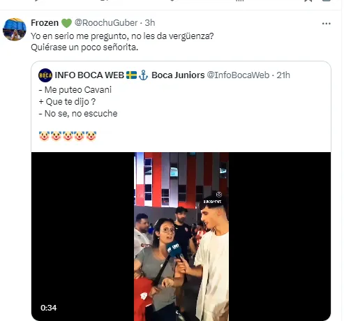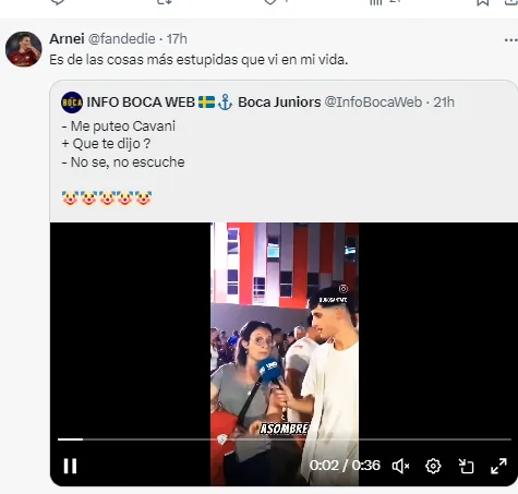 La cuenta Info Boca Web subió el recorte del video y rápidamete se llenó de respuestas de los hinchas del Xeneize, indignados con el argumento de la hincha de “denunciar” un insulto que no escuchó por parte del uruguayo.