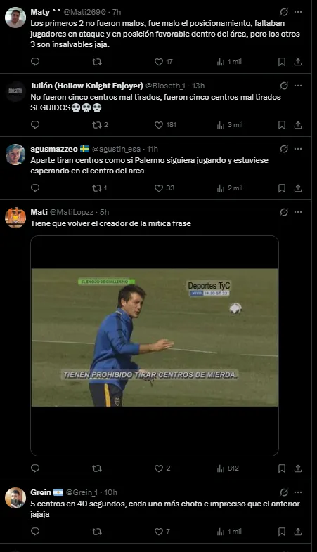 “Qué deprimente ver esto“, “Qué diría Schelotto?“, “Por qué no patean al arco?“, fueron algunas de las quejas de los hinchas en X (Twitter) e Instagram sobre la secuencia que expuso al Xeneize. Muchos recordaron a Guillermo Barros Schelotto por su célebre frase siendo DT del club en 2016: “Tienen prohibido tirar centros de m…“.