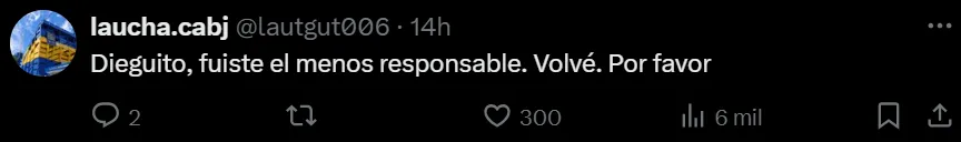 Luego de esta derrota, que cortó una seguidilla de tres victorias al hilo, los hinchas del Ciclón de Barrio Obrero, criticaron duramente al técnico. Con este panorama, Martínez quedó en la cuerda floja y podría ser despedido si es que no logra un triunfo ante Palmeiras por la Copa Libertadores. Ante la posibilidad de que se vaya, en las redes, algunos hinchas de Boca se hicieron eco de esta noticia y realizaron un insólito pedido.
