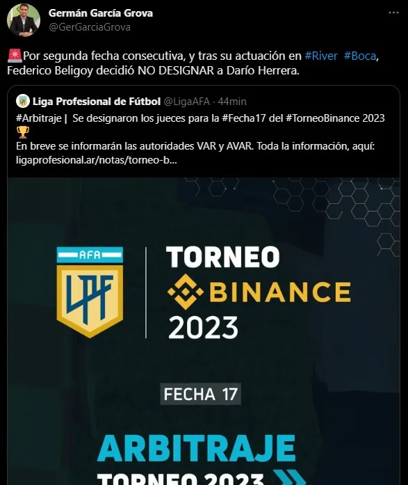 El periodista Germán García Grova dejó en claro que fue por su actuación en el Superclásico: “Por segunda fecha consecutiva, y tras su actuación en River-Boca, Federico Beligoy decidió NO DESIGNAR a Darío Herrera”. Con respecto al partido de este viernes a la noche ante Argentinos Juniors, el árbitro será Fernando Echenique.