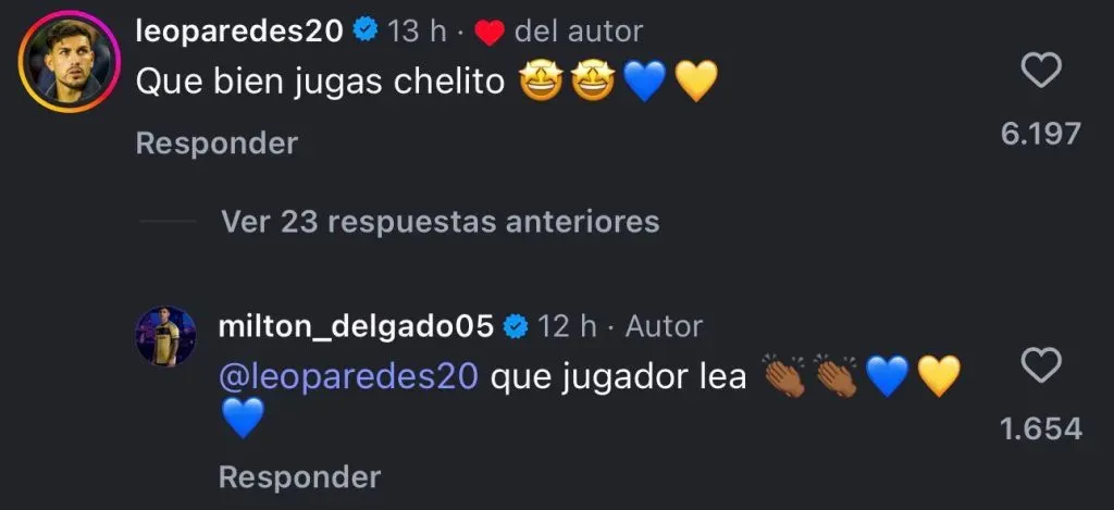 Pero Delgado no quiso quedarse atrás y decidió responder el elogio del campeón del mundo: “Que jugador, Lea”. A su vez, a la devolución le agregó emojis de manos aplaudiendo y, al igual que Paredes, unos corazones con los colores del Único Grande.