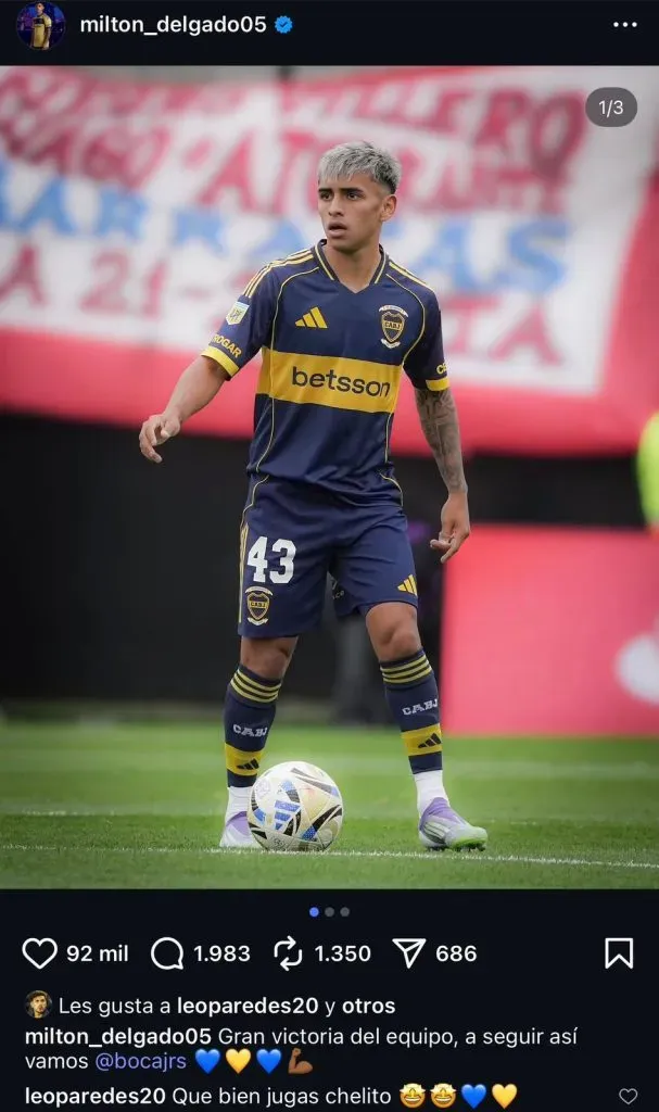 Paredes suele ser muy activo en sus redes sociales. En más de una ocasión, el volante suele dejar un lindo mensaje a cada uno de sus compañeros tras cada partido de Boca. Ahora volvió a ser el turno de Milton Delgado, que tuvo un gran rendimiento ante Barracas Central.