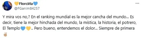 Mientras los hinchas ingresaban poco a poco al recinto, la periodista de La Nación+, Carla Ricciotti, lanzó una picante burla sobre la casa de los Xeneizes y el video no tardó en viralizarse. No solo eso, sino que los simpatizantes del Único Grande no se lo tomaron bien y generó una catarata de tuits de todo tipo en su contra. Tiempo después, la notera mostró algunas de las agresiones y soltó una picante respuesta.