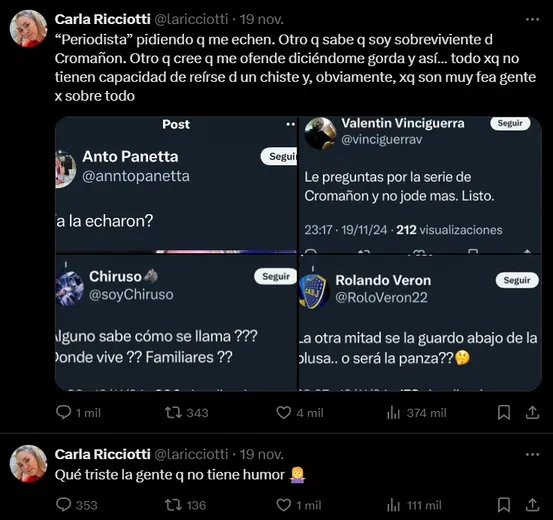 En su cuenta de “X” (Twitter), escribió: “‘Periodista’ pidiendo que me echen. Otro que sabe que soy sobreviviente de Cromañon. Otro que cree que me ofende diciéndome gorda y así… todo porque no tienen capacidad de reírse de un chiste y, obviamente, porque son muy fea gente por sobre todo”. No solo fue ese mensaje. Luego, prosiguió: “Qué triste la gente que no tiene humor”.
