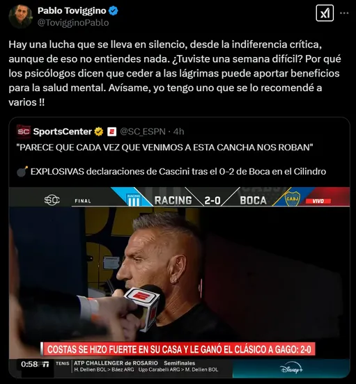 “¿Tuviste una semana difícil? Porque los psicólogos dicen que ceder a las lágrimas puede aportar beneficios para la salud mental. Avísame, yo tengo uno que se lo recomendé a varios“, lanzó Toviggino quien compartió un fragmento de las declaraciones del exvolante boquense.