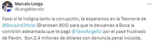 Sus declaraciones no pasaron por alto y Marcelo Lenga no se calló nada. El vicepresidente de la Asamblea utilizó su cuenta de “X” y le envió un fuerte mensaje, recordando un viejo episodio: “Fassi si te indigna tanto la corrupción, te esperamos en la Tesorería de @BocaJrsOficial (Brandsen 805) para que le devuelvas a Boca la comisión adelantada que te pagó @TanoAngelici por el pase frustrado de Pavón. Son 2.4 millones de dólares con denuncia penal incluida”.