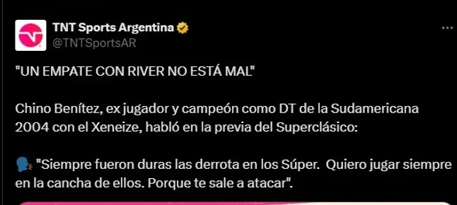 Boca jugará contra River el Superclásico del fútbol argentino este domingo a partir de las 17 horas en el Monumental. Como era de esperarse, varios protagonistas ya empezaron a palpitar la previa del encuentro y uno de ellos fue Jorge el “Chino” Benítez.