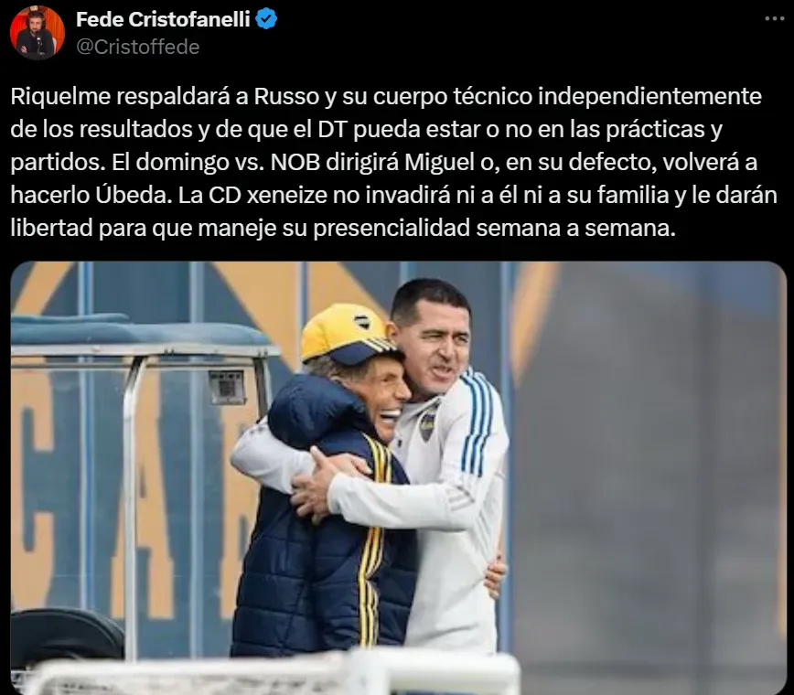 Según informó el medio Infobae, Riquelme tomó la postura de respaldar bajo cualquier circunstancia a Russo para evitar especulaciones, en especial con su salud. A su vez, la fuente citada indicó que el presidente lo ratificará en el cargo, al menos hasta diciembre. Por lo que el Xeneize se asegura al DT hasta fin de año.