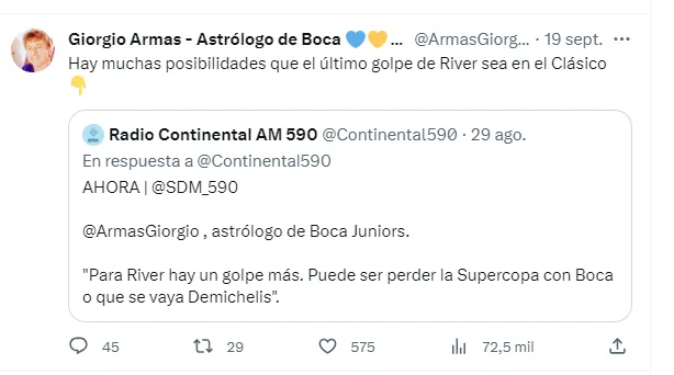 Creer o reventar: a poco más de una semana del encuentro, el conocido astrólogo de Boca, Giorgio Armas, dio algunas predicciones relacionadas con el Superclásico del fútbol argentino. La primera de ellas, quizás la más sorpresiva.