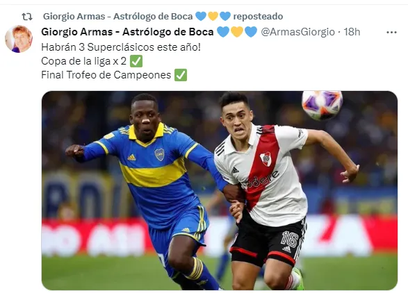 Armas, que ya acertó en la serie ante Racing y dio su pronóstico de lo que sucederá ante Palmerias, anunció que habrán tres Boca-River de acá a fin de año: dos por Copa de la Liga (uno el 1° de octubre y otro en cruces de elminación) y otro en la final del Trofeo de Campeones.