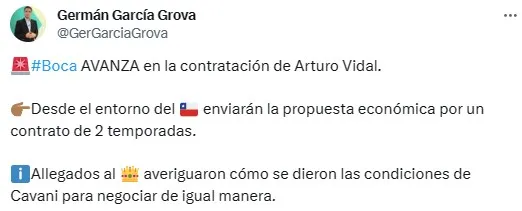 “Hace unos años dije que soñaba y que él nació para jugar acá. Con Cavani dije lo mismo, ¿no? Hay jugadores que nacieron para jugar con nuestra camiseta. A Cavani nos costó mucho tiempo convencerlo, estamos orgullosos y felices de tenerlo con nosotros. Y Vidal lo mismo. Son jugadores extraordinarios, estrellas mundiales que para nosotros sería un sueño tenerlo jugando en La Bombonera”, confesó.