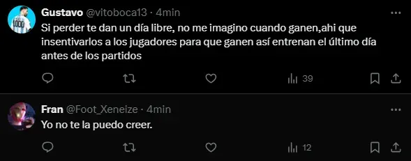 Luego de conocerse que Russo le daría un día libre al plantel a pesar de la caída, los simpatizantes de Boca se mostraron completamente en desacuerdo. Y es que, en el pasado, otros entrenadores tuvieron el mismo modus operandi y nada de eso funcionó.