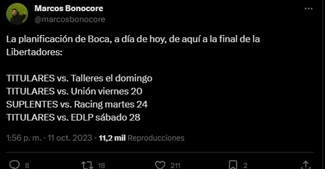 Además, frente a Unión el próximo viernes 20 de octubre se vería también un equipo con mayoría de titulares mientras que el martes 24 en Avellaneda contra Racing se presentaría un once alternativo pensando en el encuentro ante el Pincha y obviamente frente a Fluminense. En base a esto, la fuente citada mencionaba: “La intención de Almirón es poner el equipo más titular posible contra Unión. Y una rotación un poco más amplia contra Racing“. También, hace algunos días el plan del cuerpo técnico había sido informado por Marcos Bonocore.