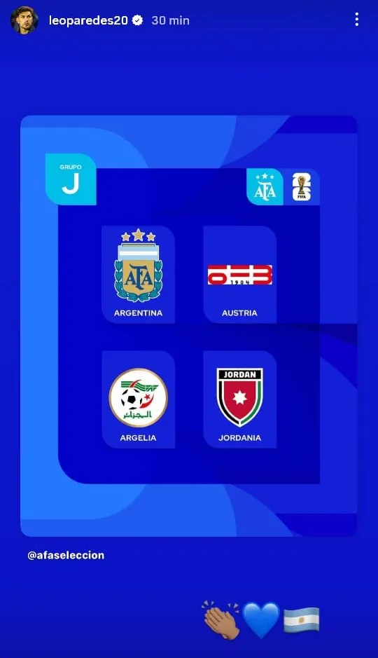 Una vez que la “Albiceleste” conoció a sus tres rivales para la fase de grupos, el referente del “Xeneize” se expresó en redes sociales. En una de sus ‘stories’ de Instagram, compartió el posteo de @AFASeleccion y con algunos emojis, con la bandera incluida, ya comenzó a pensar en la próxima Copa del Mundo.