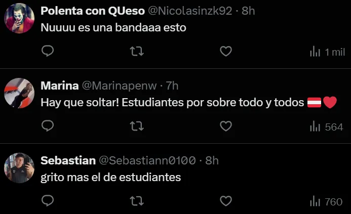 “Es un montón”, “Hay que soltar, Estudiantes por sobre todo y todos”, “No podés”, “Sáquenle el palco a este”, fueron algunos de los comentarios que postearon los hinchas del Pincha. La gente se expresó incluso en el estadio, cuando comenzó a entonar “el que no salta, es un traidor” al enterarse de la presencia de Ascacibar en el lugar.