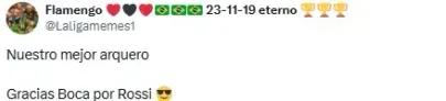 Entre amagues a un rival y su tranquilidad para iniciar el juego desde el área, este accionar no tardó en viralizarse por las redes sociales. Por un lado, los hinchas del Mengao se deshicieron en elogios y algunos simpatizantes del Xeneize hasta pidieron por su regreso. “Está loco“, “Cuánta frialdad y nivel” o “Arquerazo” fueron algunos comentarios en “X” (Twitter).