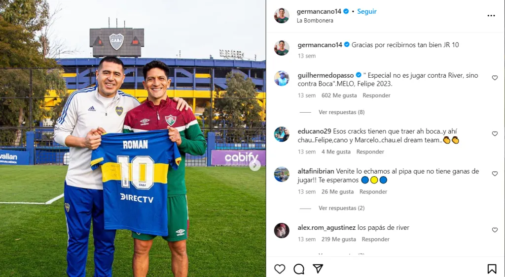 Y siguió: “Fue un momento lindo que va a quedar para siempre marcado en mi corazón porque no lo conocía y sabemos lo que significa Riquelme en el Mundo Boca. Siempre estaré agradecido”. Fluminense entrenó en Casa Amarilla en la previa de su duelo ante Argentinos Juniors por la ida de los 8vos de final de la Copa Libertadores. Riquelme posó junto a Cano, Ganso, Felipe Melo y Marcelo.