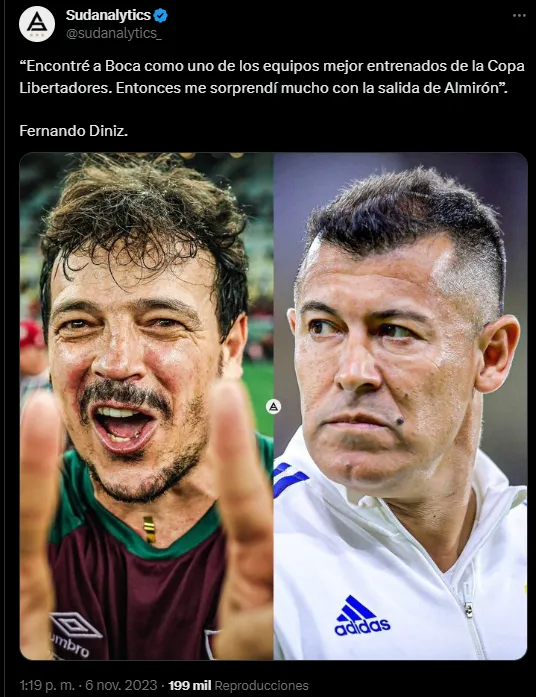 Fernando Diniz, DT del Flu, opinó sobre la salida del entrenador xeneize: “Encontré a Boca como uno de los equipos mejor entrenados de la Copa Libertadores. Entonces me sorprendí mucho con la salida de Almirón”. Luego lo felicitó por el trabajo realizado y le deseó mucha suerte para el futuro en su diálogo con el periodista Pablo Muney.