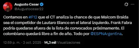 Según reveló el periodista Augusto César de ESPN, para el cuerpo técnico Braida pasa a ser el principal competidor de Blanco en la defensa y Fabra dejaría de ser convocado muy pronto. Esto da a entender que no hay retorno en cuanto a la situación del cafetero, que siempre mantuvo su postura de quedarse a pelear un lugar en el club aunque ningún DT lo tuviera en cuenta.