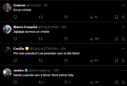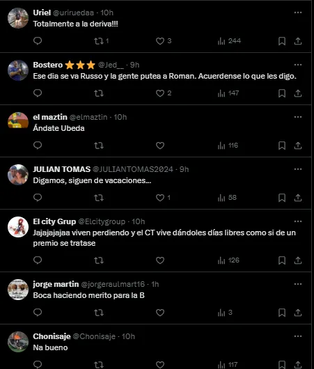 “Siguen de vacaciones“, “Totalmente a la deriva“, “Es una cargada“, “Es un chiste“, fueron algunos de los comentarios de los hinchas sobre el día libre de los jugadores. El martes regresarán a la actividad pensando en Racing, a quien recibirán en La Bombonera.