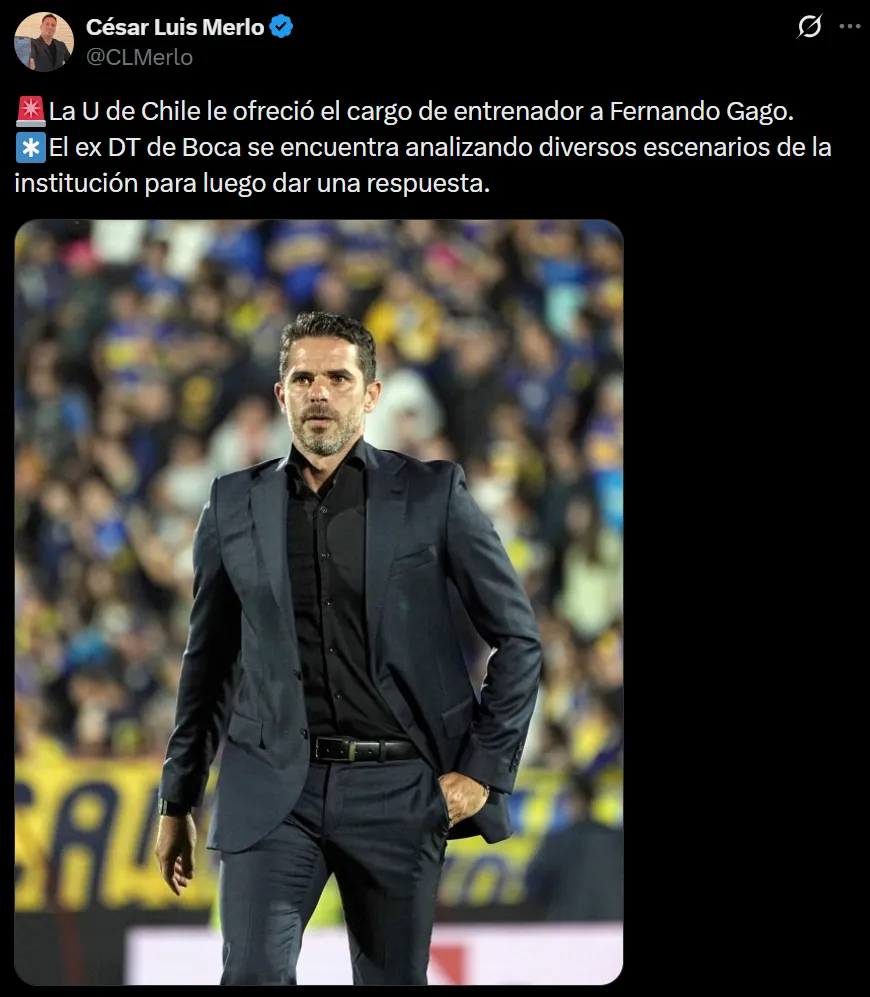 Desde entonces, Gago se encuentra a la espera de una oferta que lo convenza para continuar su carrera como entrenador. Según informó el periodista César Luis Merlo, el equipo trasandino tiene al ex DT de Boca como principal candidato para suceder a Francisco Meneghini y le ofreció el cargo.