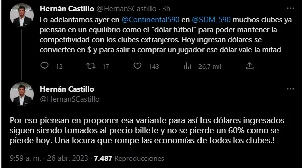 Ahora el periodista Hernán Castillo reveló nuevos detalles sobre este tema. “Muchos clubes ya piensan en un equilibrio como el ‘dólar fútbol’ para poder mantener la competitividad con los clubes extranjeros. Hoy ingresan dólares se convierten en pesos y para salir a comprar un jugador ese dólar vale la mitad“, aseguró.