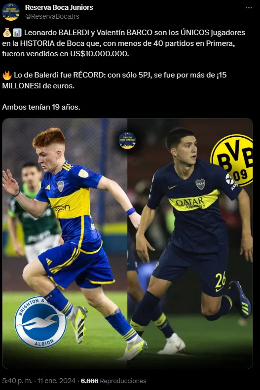 En el caso del central, está el agregado de que se terminó yendo por 15 millones de euros al Borussia Dortmund habiendo jugado solo 5 partidos en Primera. Y en cuanto a jugadores del club que partieron a la Premier League, Barco se convirtió en el cuarto en la lista, pero siendo el único que pudo llegar a debutar en el Xeneize.