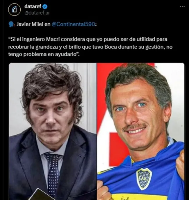 Javier Milei se convirtió en el nuevo presidente de la República Argentina y hace algunas semanas dejó en claro su postura polítca respecto a las elecciones que se vienen en Boca. De esta manera, en su momento, le brindó su apoyo a Mauricio Macri, candidato a vicepresidente de Andrés Ibarra: “Si el ingeniero Macri considera que yo puedo ser de utilidad para recobrar la grandeza y el brillo que tuvo Boca durante su gestión, no tengo problema en ayudarlo, obviamente“.