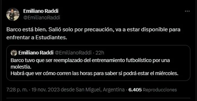 En la práctica del día domingo, Valentín Barco comenzó jugando para el equipo titular pero debió ser reemplazado por una molestia muscular. En su lugar entró el juvenil Jabes Saralegui. No obstante, se reveló a través de Emiliano Raddi que salió únicamente por precuación y estará ante el Pincha el próximo miércoles en Córdoba.