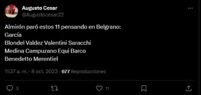 El equipo que formó en el día de ayer pensando en Belgrano fue: Javier García; Lucas Blondel, Bruno Valdez, Nicolás Valentini, Marcelo Saracchi, Cristian Medina, Jorman Campuzano, Equi Fernández, Valentín Barco, Darío Benedetto y Miguel Merentiel.