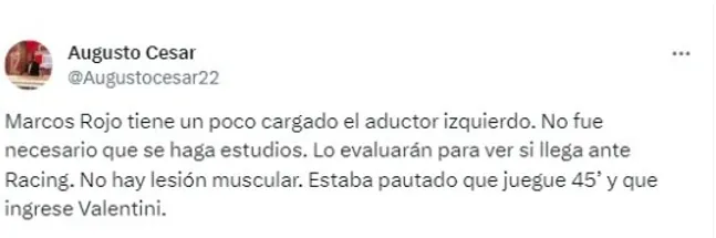 En el pasado partido ante Unión en La Bombonera, Marcos Rojo salió en el entretiempo a raíz de una molestia muscular en su aductor y su reemplazo fue Nicolás Valentini. Si bien en las horas posteriores hubo preocupación por el estado de salud del defensor, se pudo confirmar que el ex Estudiantes no tiene lesión. Asi lo informó el periodista Augusto César: “Tiene un poco cargado el aductor izquierdo. No fue necesario que se haga estudios, no hay lesión muscular”.