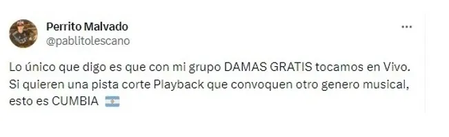 Como era de esperarse, la noticia se movilizó por las redes sociales y fue el mismo cantante quien impuso una condición a la CONMEBOL para hacer su presencia en Río de janeiro: “Lo único que digo es que con mi grupo DAMAS GRATIS tocamos en Vivo. Si quieren una pista corte Playback que convoquen otro genero musical, esto es Cumbia“.