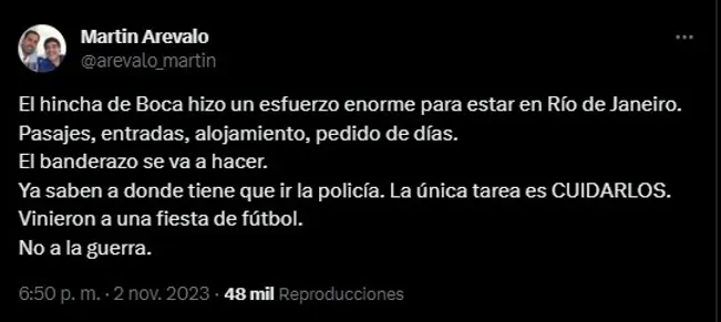 El mensaje citaba: “Repudiamos los actos de violencia y racismo que se puedan producir en el marco de esta final. Un llamado a los hinchas de Boca y Fluminense a compartir todos juntos los momentos de alegría y celebración que nos dan nuestro fútbol”.