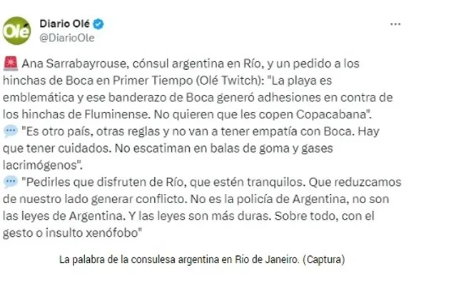 Después de lo que fueron los incidentes en la playa de Copacabana entre hinchas de Boca y barras de Fluminense, quien se pronunció al respecto fue Ana Sarrabayrouse, consulesa argentina en Río de Janeiro.
