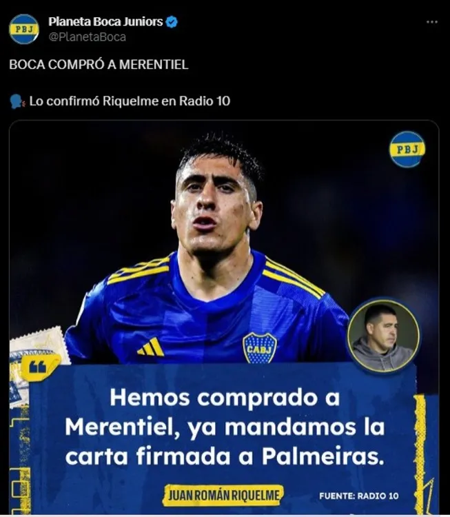 Después de su gran 2023 con la camiseta Xeneize, Juan Román Riquelme oficializó la compra del pase de Miguel Merentiel. El delantero se encontraba a préstamo desde Palmeiras y ahora el club de la Ribera desembarcó cerca de 3 millones de dólares por el 70% de su pase.