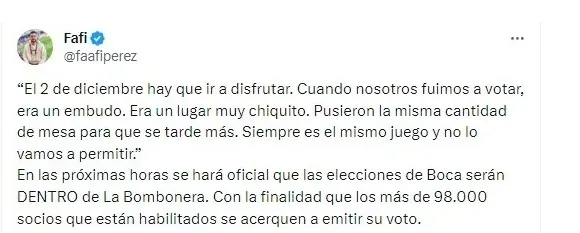 Y es que, tras la información revelada por el periodista Facundo Pérez, se dio a conocer que la votación se estará realizando por primera vez dentro del campo de juego de La Bombonera: “En las próximas horas se hará oficial que las elecciones de Boca serán dentro de La Bombonera“. Anteriormente, se llevaba acabo dentro de las inmediaciones del club.