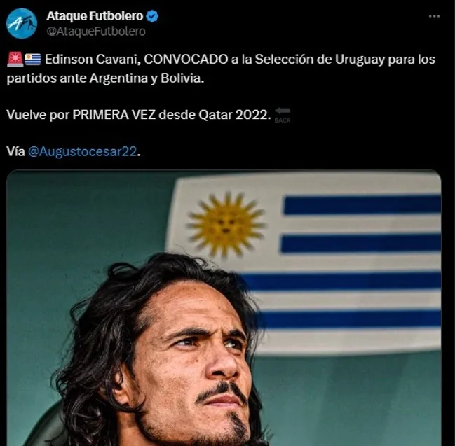 Mientras que el juvenil se encuentra hace rato lesionado, los 2 otros jugadores no podrán estar debido a sus convoctorias a sus respectivas selecciones nacionales. El lateral será convocado por Juan Reynoso por Perú y Cavani será citado por Marcelo Bielsa por Uruguay como bien pudo informar Augusto César.