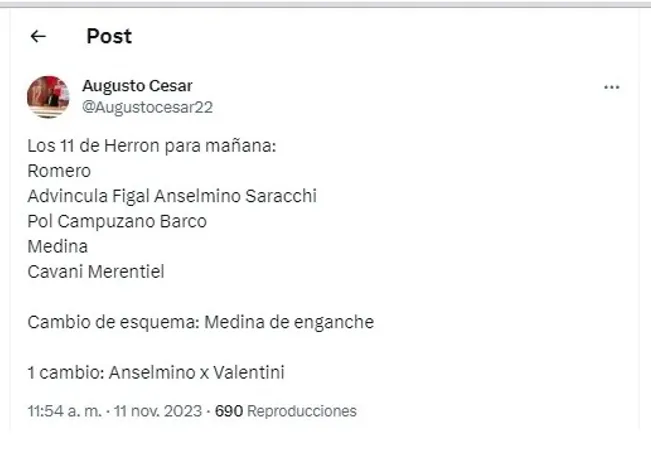 Tras lo informado por Augusto César, Boca formará contra Newell´s en su cancha de la siguiente manera: Sergio Romero; Luis Advíncula, Nicolás Figal, Aaron Anselmino, Marcelo Saracchi; Guillermo Fernández; Jorman Campuzano, Valentín Barco; Cristian Medina; Edinson Cavani y Miguel Merentiel.