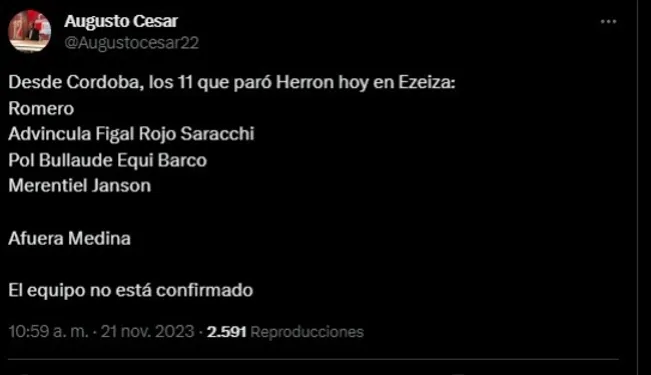 Por ende, tras lo informado por Augusto César, el probable equipo de Boca vs. Estudiantes es: Sergio Romero; Luis Advincula, Nicolás Figal, Marcos Rojo, Marcelo Saracchi, Pol Fernández, Ezequiel Bullaude, Equi Fernández, Valentín Barco; Miguel Merentiel y Lucas Janson.